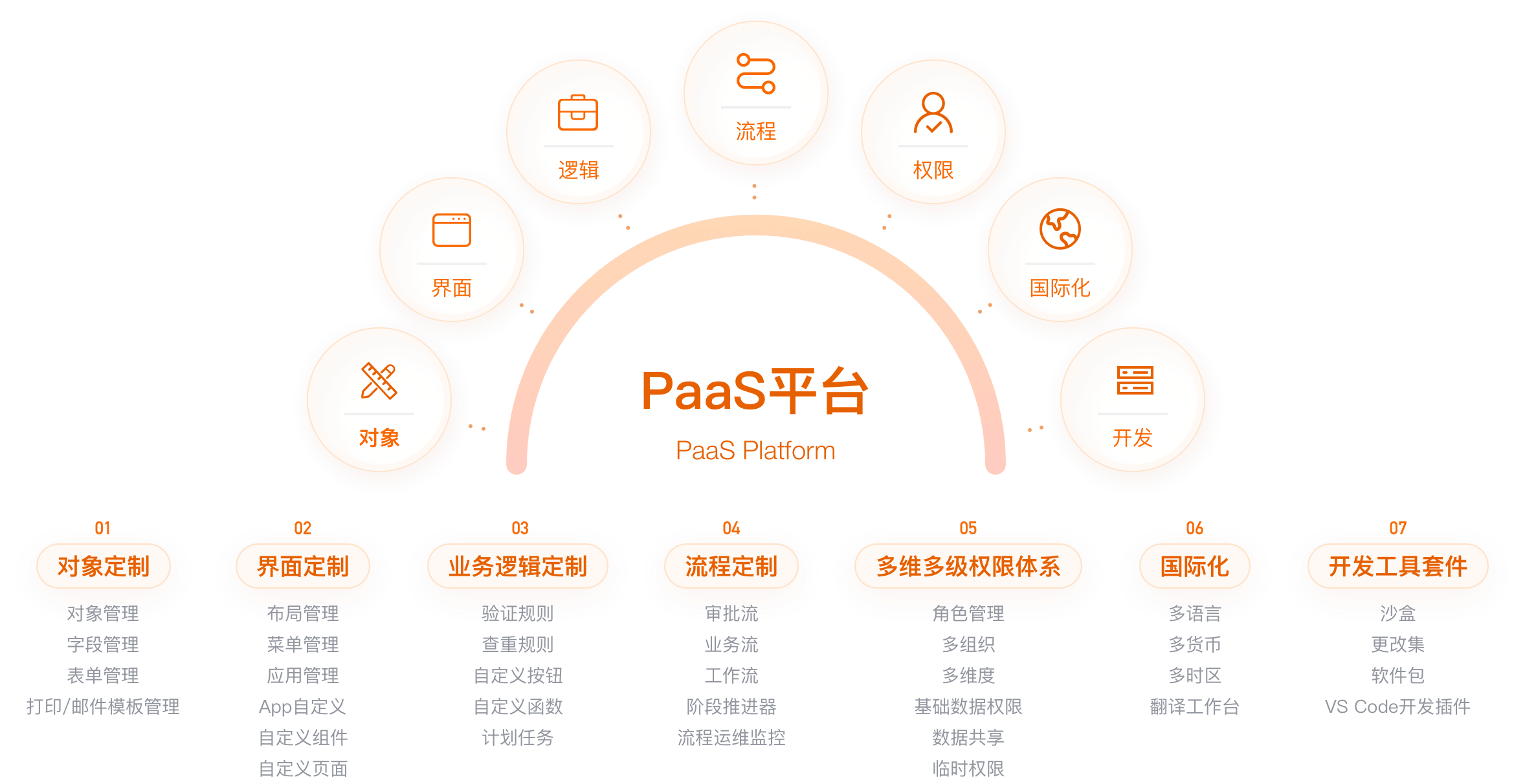 完善的功能权限,全面支持企业内部对组织,人员,角色对系统管理,业务操作,数据及字段,界面的精细管控。